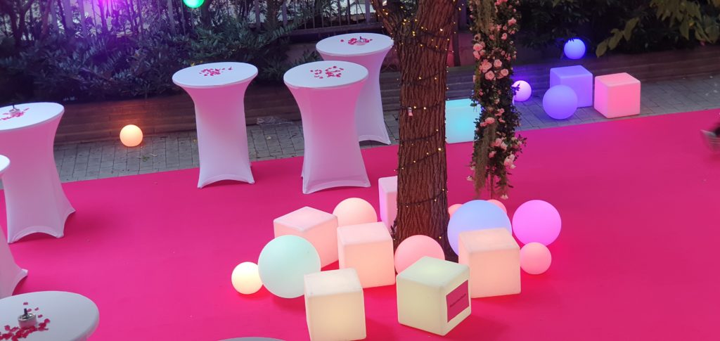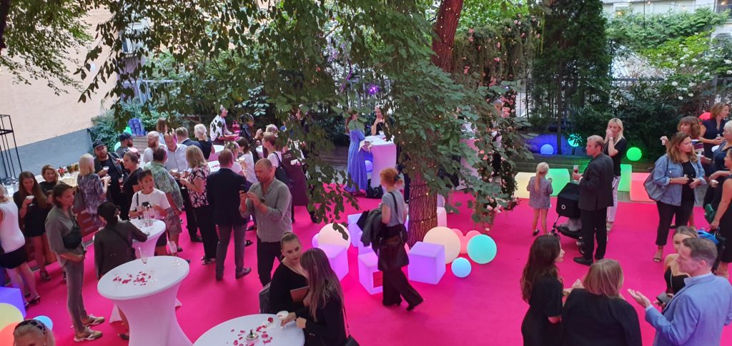 20190826 174217 - Eventkraft har tillsammans med uppdragsgivaren Dekoform AB kommit med idéer och förslag samt så småningom även levererat tekniska lösningar till invigningen av Babors butik på Östermalm i Stockholm. Eventkraft var på plats och skapade en somrig och lekfull miljö med Astera LED-kuber & bollar, ståbord, DJ-anläggning och logo-projicering.
