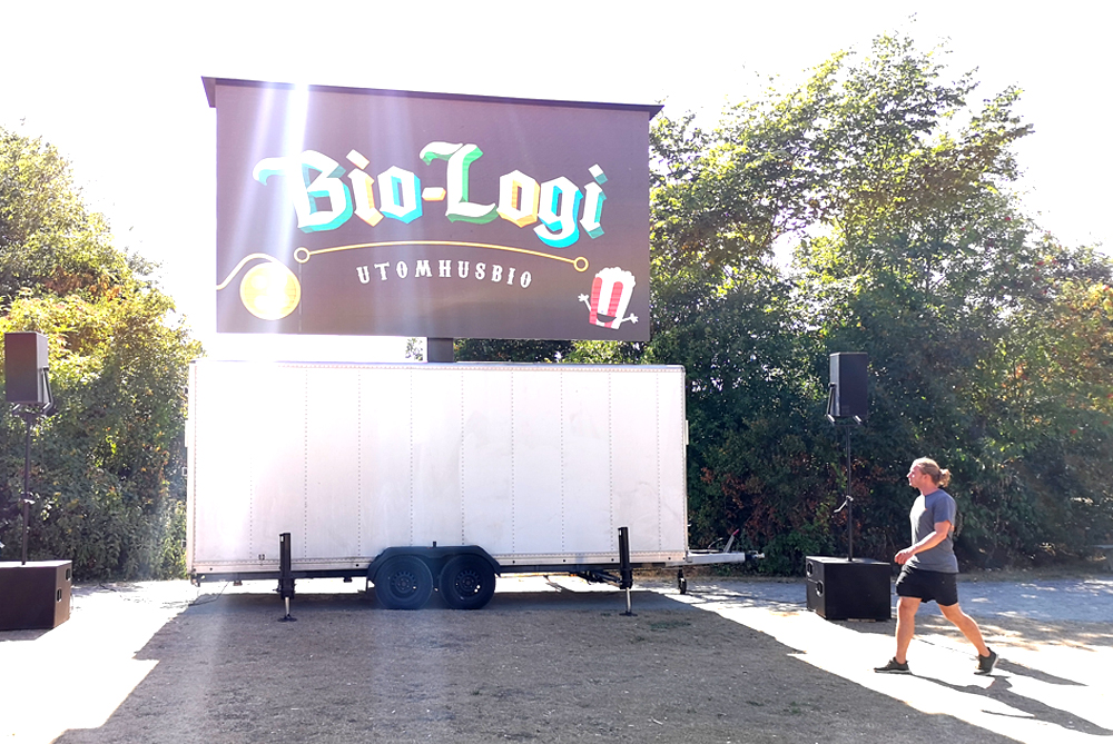Bio Logi Utomhusbio 1 e1562071152488 - Vår lösning för utomhusbio bygger på en högupplöst LED-skärm som levereras i form av en trailervagn med tillhörande ljudsystem i mycket hög kvalitet. Detta är ett snabbt och smidigt sätt att få ut en storbildsskärm till en liten eller stor publik. Vi har allt ni behöver för att genomföra detta. Film kan visas från dator, DVD, Blueray eller liknande. Det finns också möjlighet att projicera på en befintlig vit vägg med kraftfull projektor.