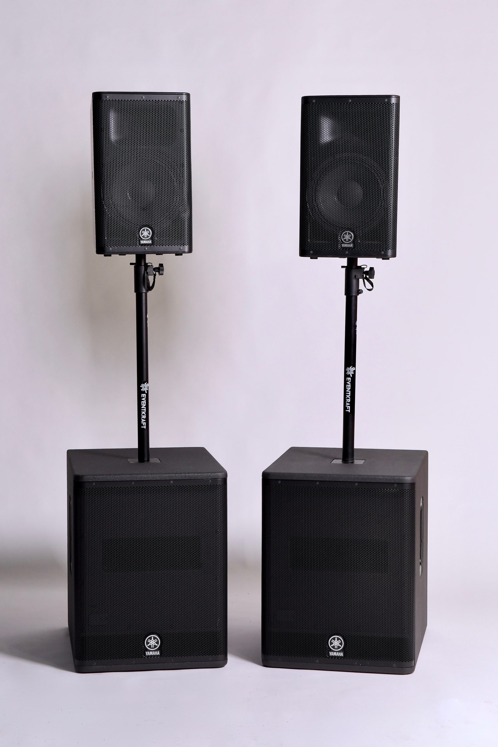 Högtalarsystem Yamaha DXR + DXS är ett av våra mest uthyrda ljudsystem. Det är enkelt att koppla upp och det har en rejäl botten vilket gör att det orkar med även lite större lokaler. Högtalarsystemet har en beräknad kapacitet för publik på upp till ca 300 personer.