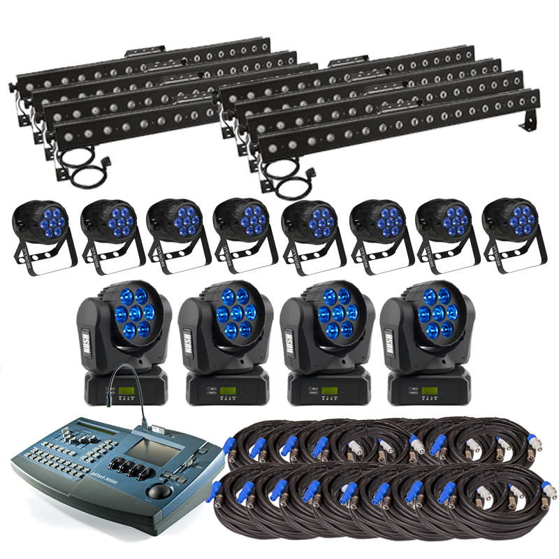 Paketet består av 8st LED-kannor, 8st LED-bars & 4st moving head wash. Armaturerna kan hängas från t.ex. rör eller tross och de kan också ställas på golvet. LED-bars är särskilt väl passande för s.k. släpljus mot väggar och de smidiga wash-head’arna är perfekta komplement för ytor där det är svårt att komma åt/täcka in. Detta ljussystem styrs med hjälp av ett avancerat DMX-ljusbord med i princip oändliga programmeringsmöjligheter. Det medföljer hakfästen och förlängningskabel för ström & dmx till varje armatur.