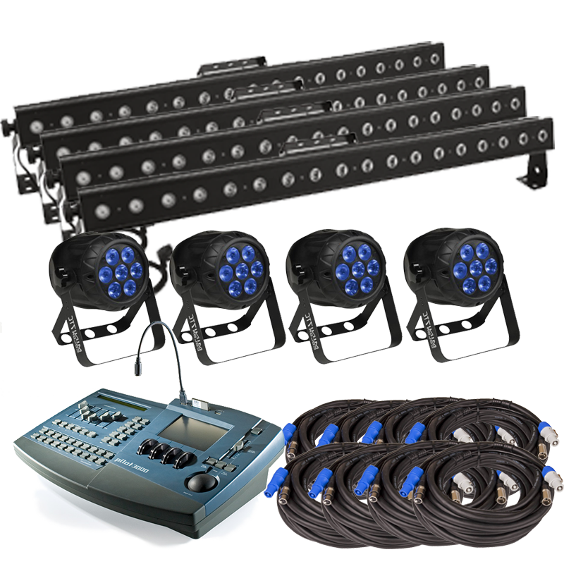 Ett miljö-ljus-paket för Dig som vill ljussätta väggar, golv, tyger, takytor och liknande med flexibla möjligheter för att korrigera och styra färgerna på ljuset. Paketet består av 4st LED-kannor & 4st LED-bars. Armaturerna kan hängas från t.ex. rör eller tross och de kan också ställas på golvet. LED-bars är särskilt väl passande för s.k. släpljus mot väggar och fasader. Systemet styrs med hjälp av ett DMX-ljusbord som enkelt justerar armaturernas RGB-färg och om man så vill varje unik armaturs växlingar över tid. Det medföljer hakfästen och förlängningskabel för ström & dmx till varje armatur.