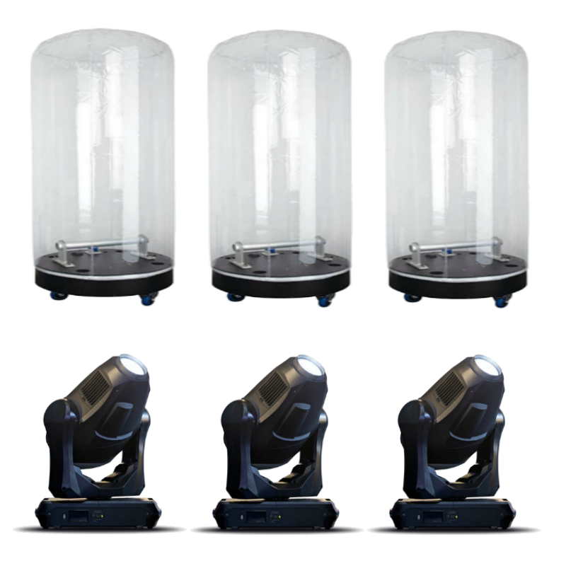 Utrustningen i detta paket kan monteras stående eller hängande. Det behövs ett eluttag med ström trefas 16A vid uppställningsplatsen. Vi hjälper er med framtagning av mönster/schablon – s.k. gobo – till projiceringen. Vi har rigg-tillbehör i form av tross, stativ och liknande om det skulle behövas.