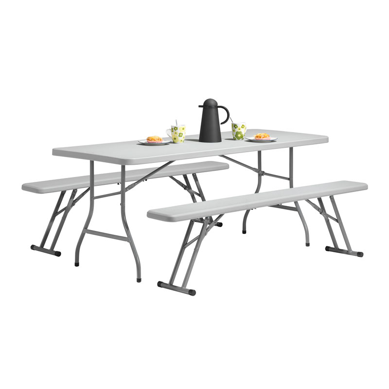 Perfekt för picknickar och utomhusarrangemang då materialet tål användning utomhus. Bordsskiva och bänkskiva är i ljusgrå högdensitetspolyeten och underreden/ben i pulverlackerad stål.