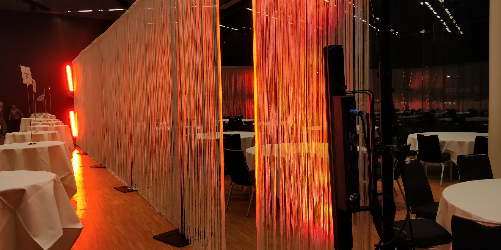 Trådgardiner blir också väldigt snygga att ljus-sätta och dom har ett snyggt fall som tilltalar ögat. Vi har trådgardiner i olika höjder för uthyrning. De flesta är 3m breda.
