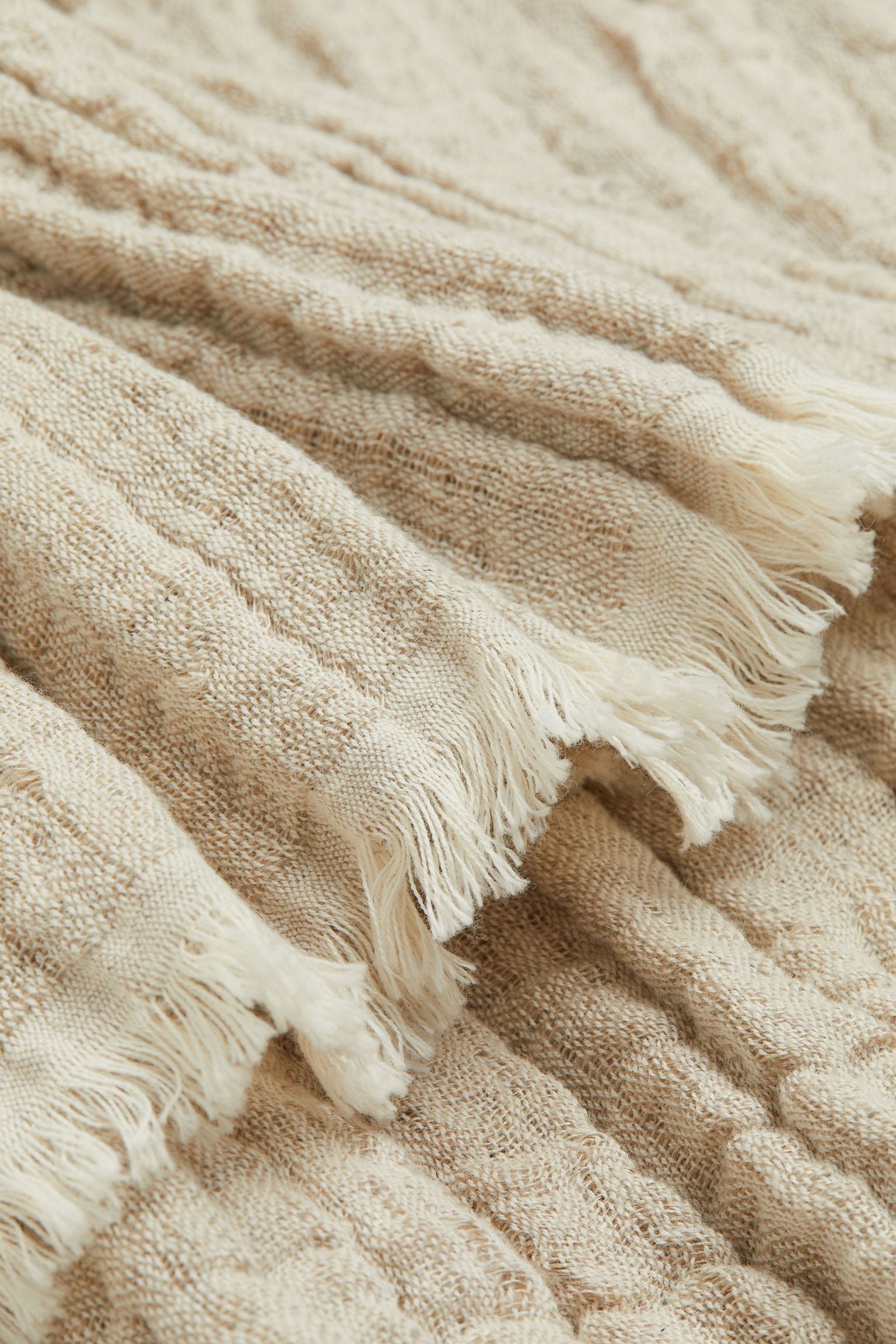 En krinklad pläd i mjuk, vävd kvalitet av lin och bomull. Pläden har rå, fransad kant längs sidorna. Ger rummet en ombonad, naturnära känsla.