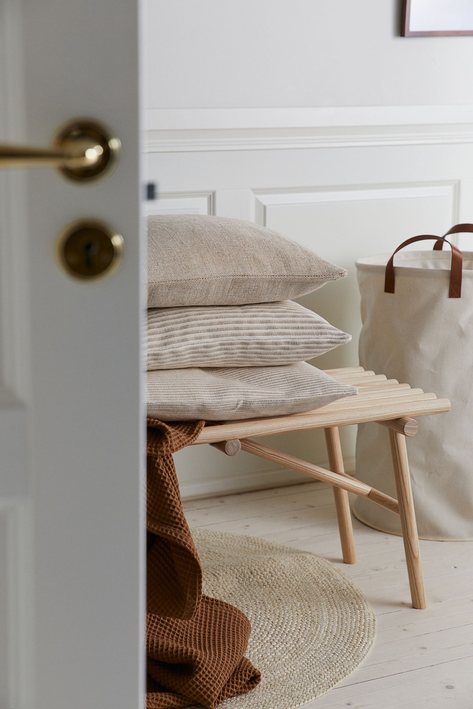 3-pack kuddar i vävd bomullskvalitet med inslag av jute. Dold dragkedja. Innerkudde i vävd bomullskvalitet med fyllning av andfjäder.