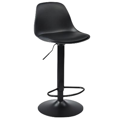 Höj- och sänkbar barstol med fotstöd. Barstol med polstrad sits i svart skinnimitation och svart underrede.