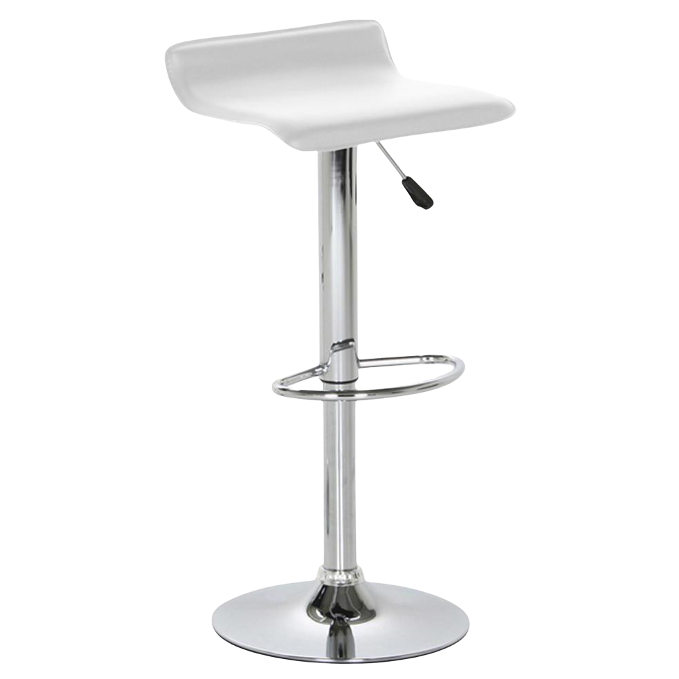 Höj- och sänkbar barstol med fotstöd. Polstrad sits i vit skinnimitation och underrede i krom.