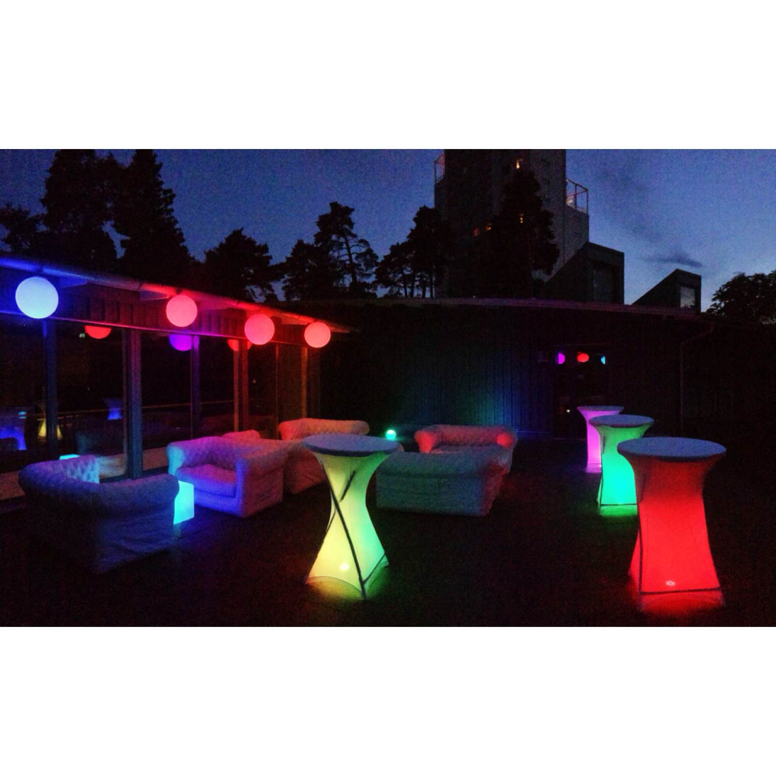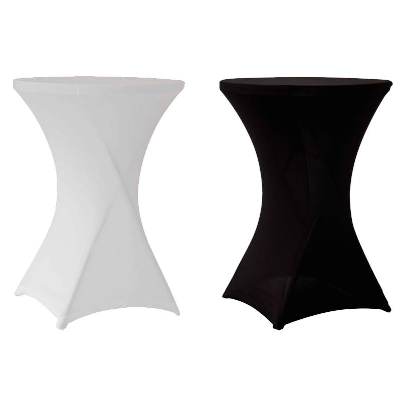 Ståbord med överdrag i flamskyddat stretchtyg. Stilfullt till fest och event. Perfekt att ljussätta inifrån och enkelt att applicera. Hyr gärna tillsammans med våra ståbord.