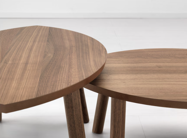 Stockholm Soffbord/satsbord, set om 2, i valnötsfaner. Dessa stilrena satsbord med lövformade bordsskivor av valnötsfaner har ett både elegant och varmt uttryck. Använd dem var för sig eller tillsammans.