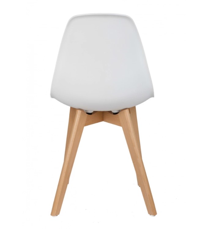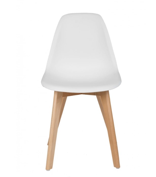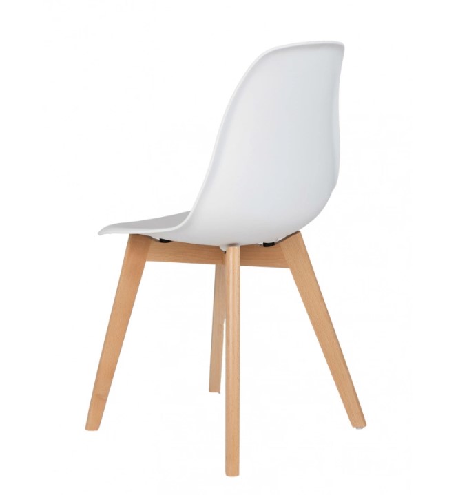 Stol i skandinavisk stil med ben i trä och rygg och sits i vit plast och inbyggd sittdyna med hög komfort.