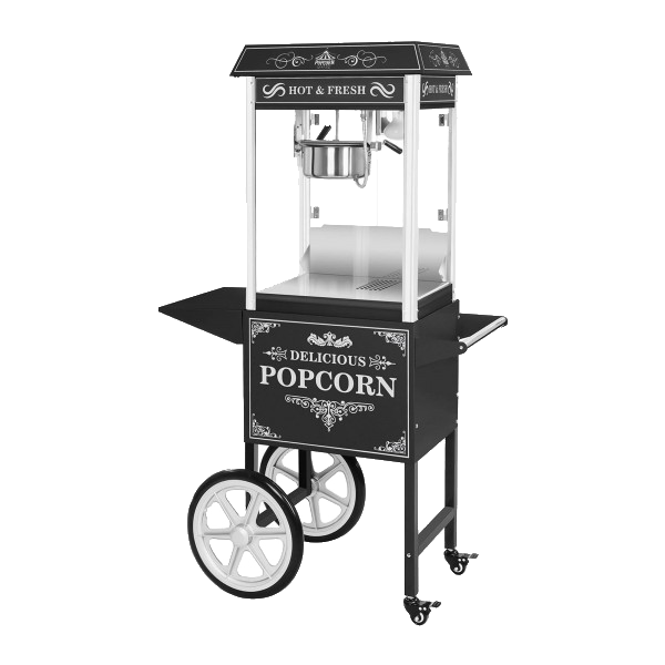 Tack vare den medföljande vagnen kan du servera dina läckra popcorn överallt! Popcornmaskinen är enkel att manövrera tack vare de stora framhjulen och de mindre bakhjulen som kan vridas 360 grader. De två små hjulen är utrustade med parkeringsbromsar som förhindrar att popcornmaskinen rullar iväg och säkerställer att vagnen står stabilt under användning.