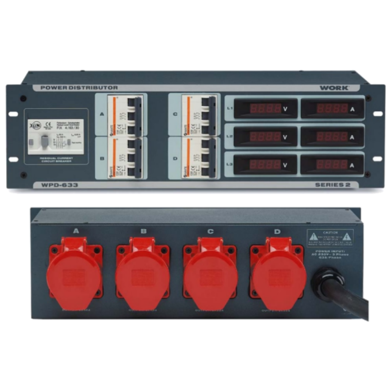 Elcentral som delar upp ett 63A 3-fas uttag till flera 32A 3-fas uttag. Med de inbyggda mätarna har du bra kontroll på den spänning och ström som levereras ut från elcentralen. På så sätt kan överbelastning lätt undvikas.