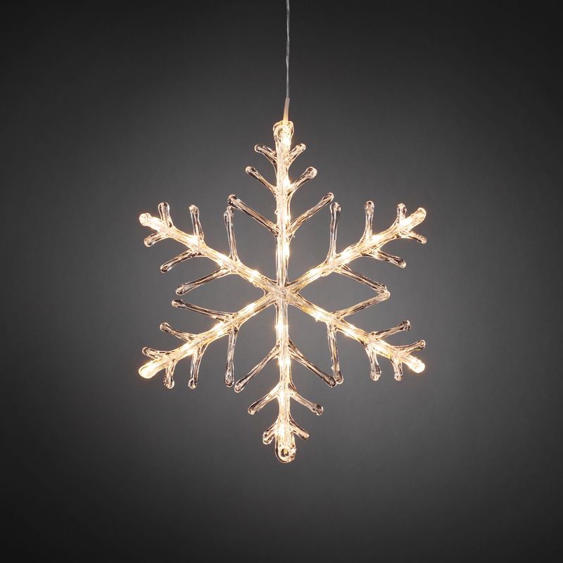 Hängande snöflinga i akryl med varmvitt ljus godkänd att hänga utomhus men passar lika bra inomhus.