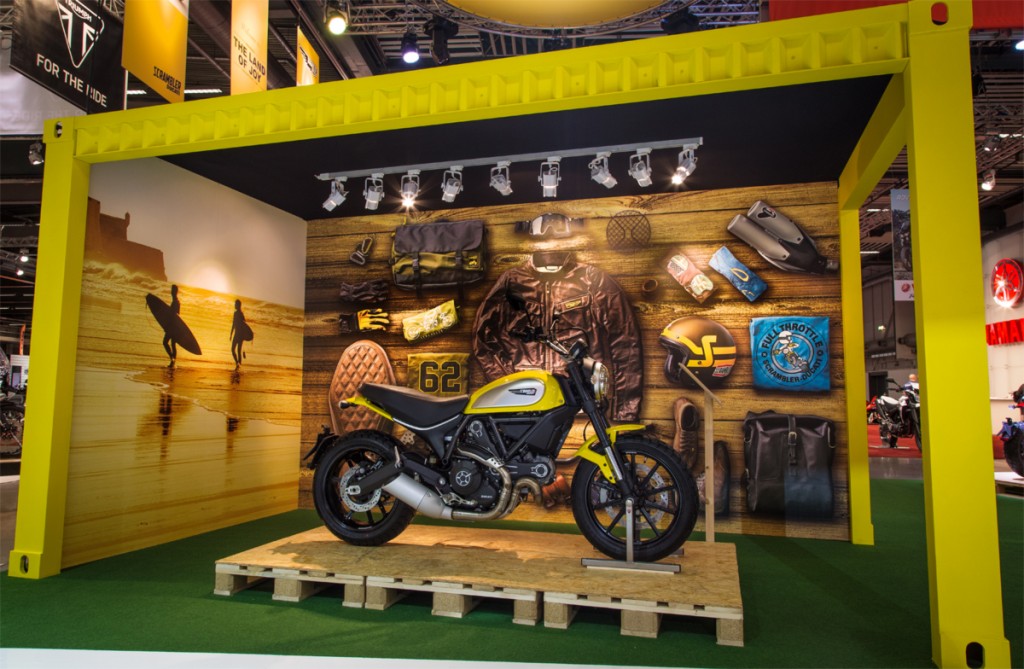 hookhuskvarna DSC 6564 scaled - Ducati ville utmärka sig lite extra på MC-mässan i Stockholm detta år och bad Parad Design Solutions att ta fram ett koncept där ljud, ljus och bild var bärande element för upplevelsen av varumärket. Resultatet blev en monter med två olika delar där den ena andades retro och rock’n roll och den andra mer klassisk expo.
